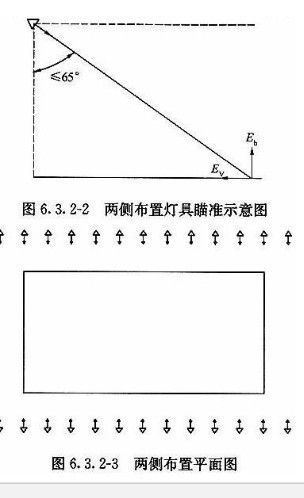 (2).兩側(cè)布燈宜選用非對(duì)稱(chēng)型配光燈具,布置在馬道上,適用于垂直照度要求較高以及有電視轉(zhuǎn)播要求的體育館。兩側(cè)布燈時(shí),燈具瞄準(zhǔn)角不應(yīng)大于65度。圖6.3.2-2, 燈具圖:6.3.2-3