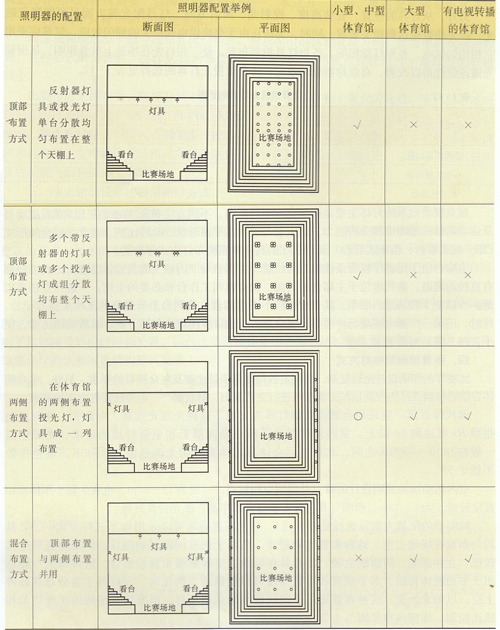 2. 燈具在場地上空和側面布置相結合。這種布置一般適用于多功能體育館,水平照度和垂直照度可以獲得適當的比率。