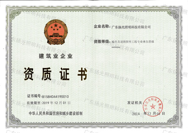 12月初,在廣東城鄉(xiāng)及住房建設(shè)廳領(lǐng)導(dǎo)的大力堅持下,經(jīng)國家住房和城鄉(xiāng)建設(shè)部審查核準,揚光照明取得“城市及道路照明工程專業(yè)承包壹級資質(zhì)”。