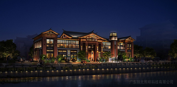 對于中式古典建筑,應(yīng)按柱位布置燈光,突出開間的韻律及檐下斗拱的豐富關(guān)系;明間部位可采取燈光加強(qiáng)措施以使上部的牌匾更引人注目。